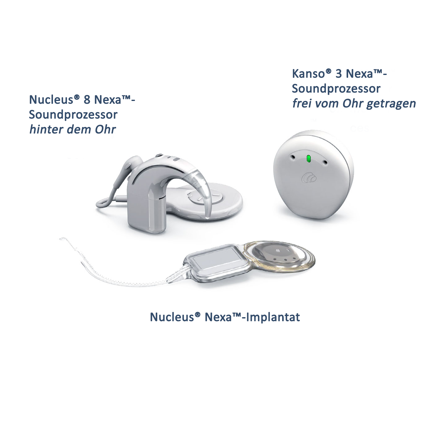 Cochlear-Implantate ahmen die Funktion eines gesunden Innenohrs nach und ersetzen geschädigte Haarzellen, sodass man klarer30,31 als mit Hörgeräten hört. Einmal geschädigte Haarzellen können sich nicht mehr regenerieren, sodass sich diese Art des Hörverlusts ohne Behandlung nicht bessert. Unsere Implantate priorisieren die Leistung und den Erhalt anatomischer Strukturen der Cochlea. Aus unserer breiten Palette von Implantaten und Elektroden können Chirurgen in Abhängigkeit vom Typ des Hörverlusts, der Anatomie der Cochlea und der Präferenz auswählen. Das Cochlear™ Nucleus® Nexa™ System besteht aus zwei Hauptkomponenten: dem externen Soundprozessor und dem Implantat, das chirurgisch eingesetzt wird und das mit einem Elektrodenträger in der Cochlea verbunden ist.